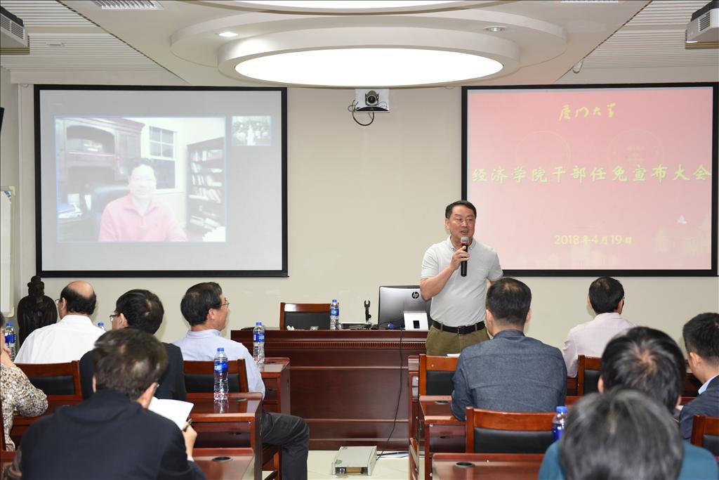 李建发在宣读任免决定后讲话。他指出,这次经济学院党委书记的调整配备,是校党委根据中央的条例和厦门大学中层领导干部选拔任用工作办法与要求,贯彻落实中央巡视整改意见,从“双一流”建设的需要和高素质领导班子建设的要求出发,经过通盘考虑、广泛酝酿、慎重研究并经校党委常委会表决做出的决定。
