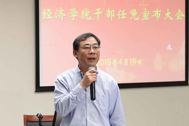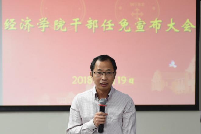 4月19日上午,经济学院干部任免宣布大会在经济楼N118召开,校党委副书记、副校长李建发在会上宣布了校党委的任免决定,黄鸿德同志担任经济学院党委书记;因任期届满,雷根强同志不再担任经济学院党委书记职务。