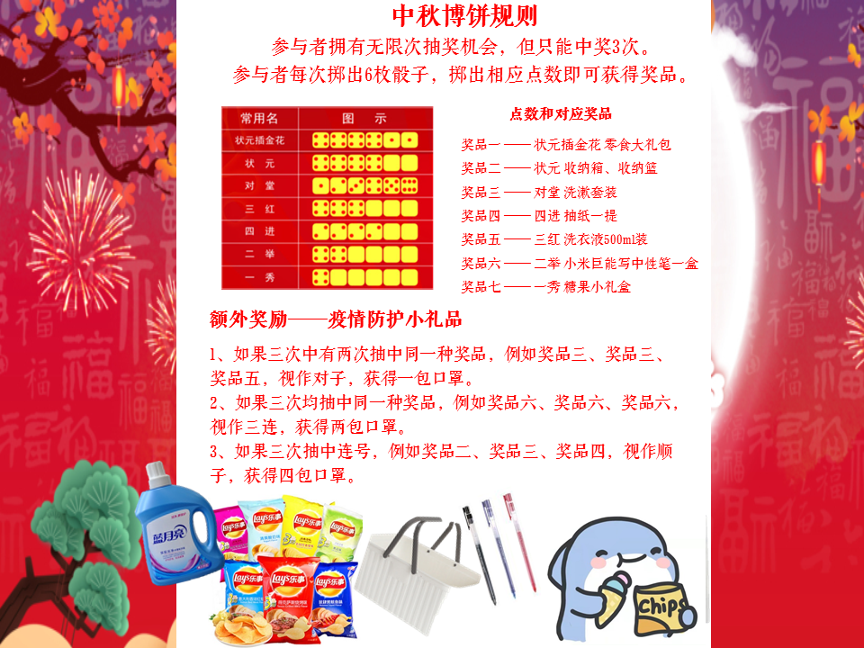 中秋博饼是民族英雄郑成功屯兵厦门时为解士兵的中秋相思之情、激励鼓舞士气而发明的,经过代代相传,成为今天厦门独具特色的民间习俗。受疫情影响,学院部分同学遵循学校统一安排,住进健康观察区,进行集中隔离,为了消解同学们在中秋佳节的孤独感,学院领导和辅导员通过线上的形式对学生进行慰问,了解他们起居生活和学习状况,并为他们举办线上博饼活动,共同感受厦门的风土人情,博出好彩,博到开心!